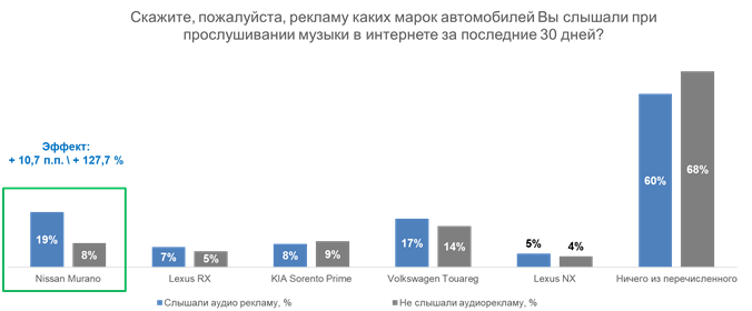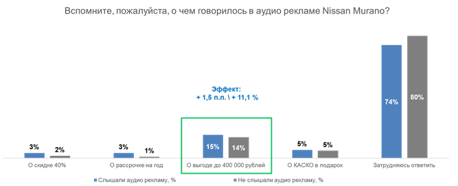 Выяснилось, что рекламная коммуникация позволила более чем в 2 раза увеличить вспоминаемость рекламируемого бренда. Пользователи, которые слышали аудио рекламу, лучше вспоминают содержание сообщения. При этом высокий уровень контрольной группы объясняется параллельной активностью Nissan Murano в виде рекламы через дилеров, а также в виде баннеров с сообщением о выгоде в 400 тысяч рублей.