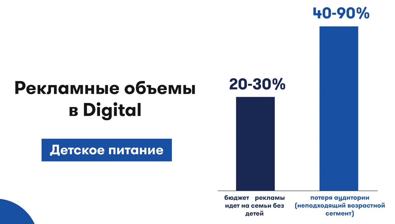 При продвижении детского питания 20−30% рекламных объемов в digital уходят в аудиторию бездетных семей. Если же речь идет о продукции, предназначенной для детей из более узких возрастных сегментов, эта потеря возрастает до 40−90%.