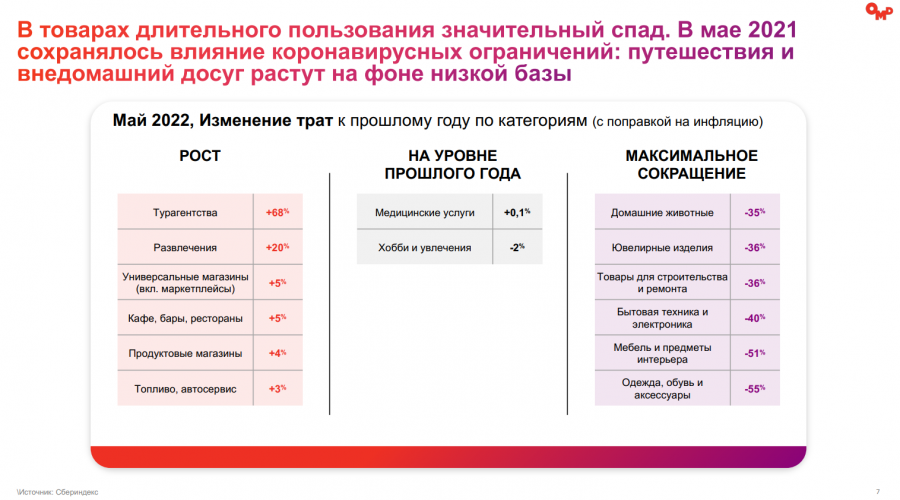 После спада ажиотажного спроса потребительские траты снизились. Кроме того, остановка инфляции в непродовольственных товарах «реанимирует рынок», сказано в отчёте. Растёт категория досуга, а в категориях товаров длительного пользования наблюдается спад: просели направление домашних животных, ювелирные изделия, строительство и ремонт, бытовая техника, мебель, одежда и обувь.