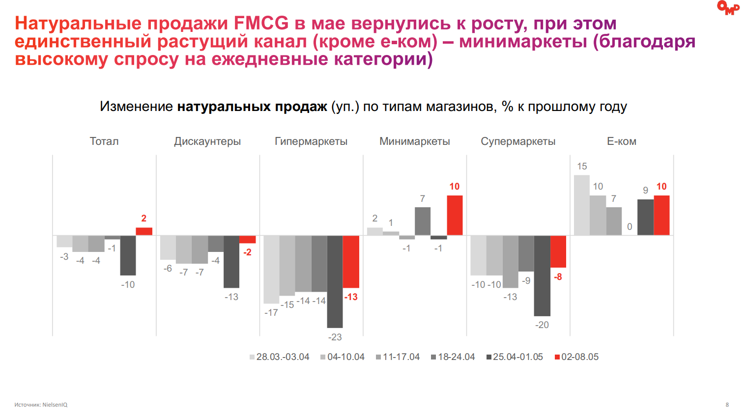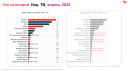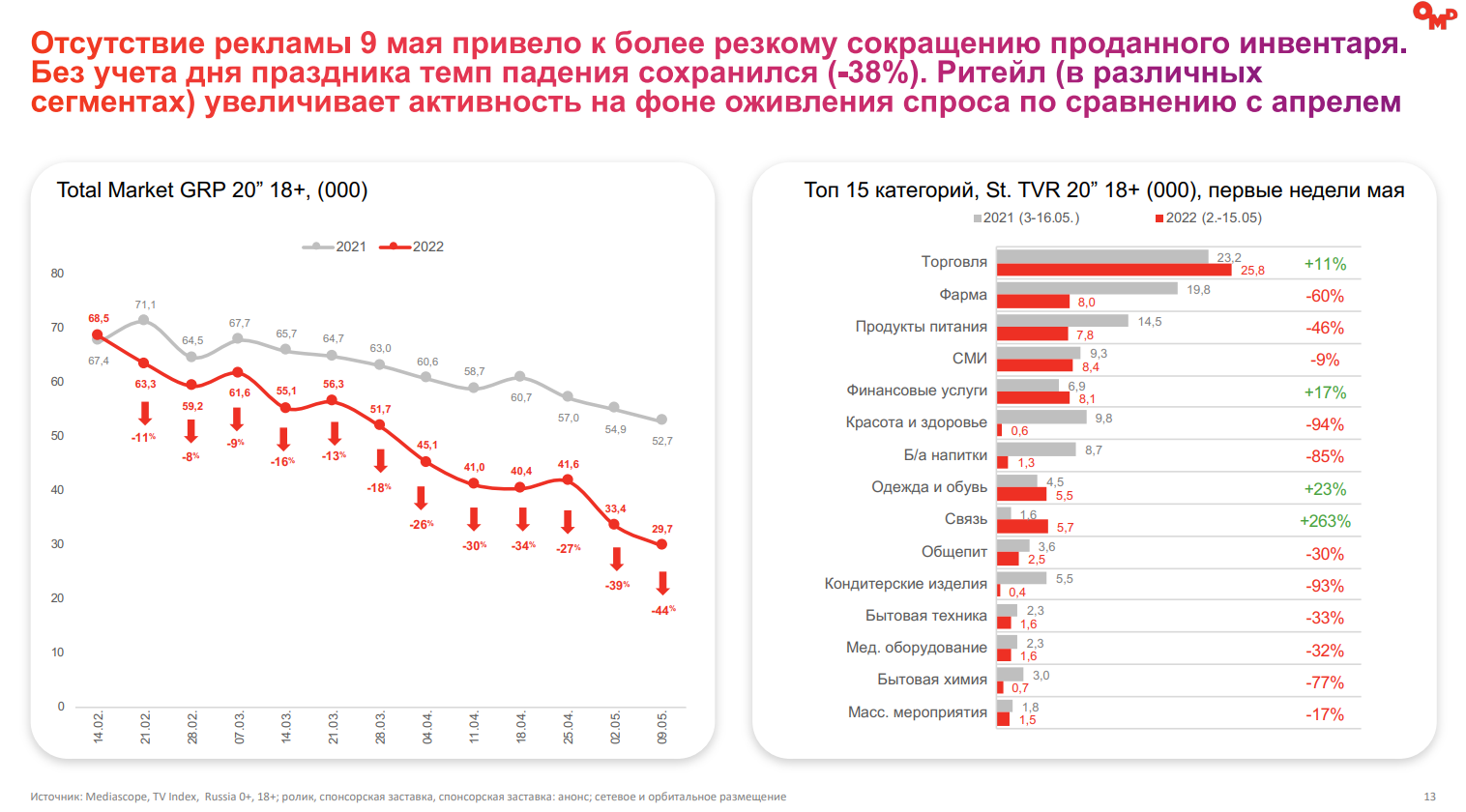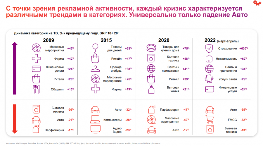 В марте-апреле в списке 20 крупнейших рекламодателей остались только две иностранных компании — Stada и KFC. В топ-15 категорий за первые две недели мая по сравнению с прошлым годом выросли только связь, финуслуги, торговля и одежда и обувь. Остальные сегменты показали спад — сильнее всех просели те, в которых значительную долю рынка занимали иностранные мультбрендовые корпорации.