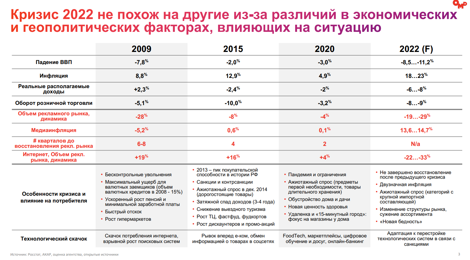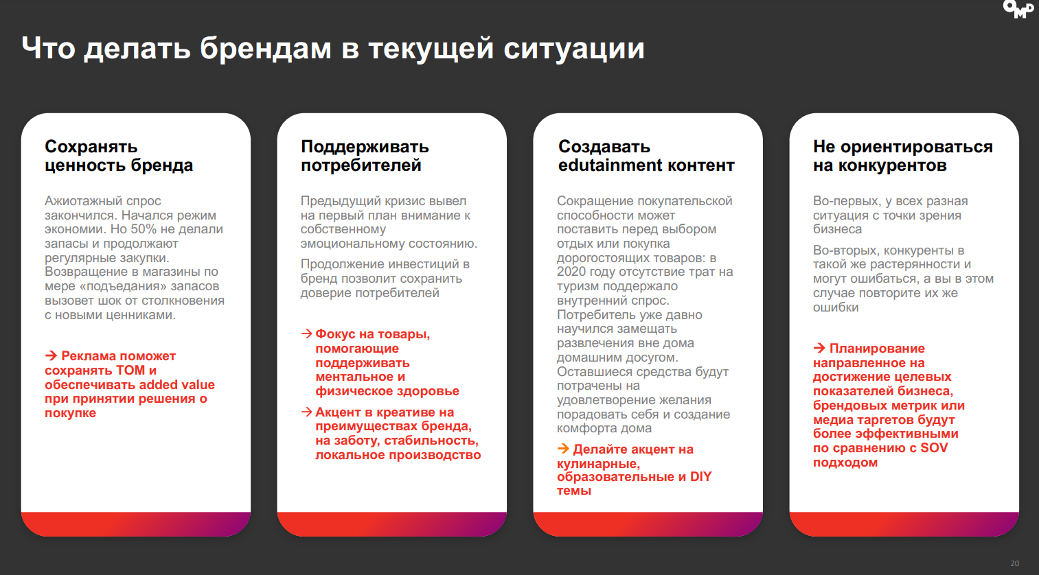 Аналитики OMD OM Group выдвинули рекомендации для брендов и агентств. Так, производителям товаров и услуг они рекомендовали сохранять ценность бренда, помогать потребителям в кризисных условиях, сделав фокус на товары для поддержания физического и ментального здоровья, предлагать развлекательно-образовательный контент и выбирать собственный путь продвижения, а не ориентироваться на конкурентов.