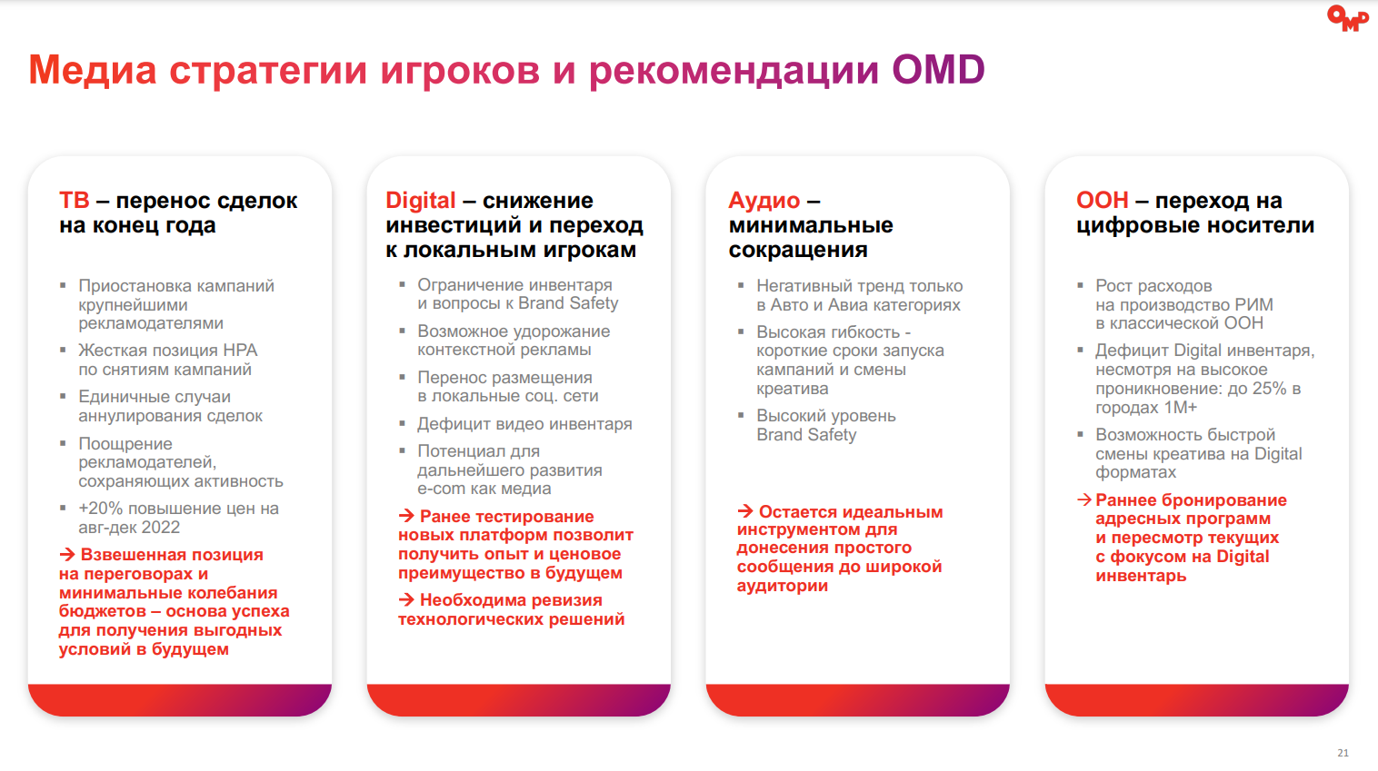 Игрокам медиарынка эксперты предлагают различные решения в зависимости от сегмента: для ТВ рекомендуется перенос сделок на конец года, в диджитал — снизить инвестиции и сфокусироваться на локальных площадках, минимально сокращать продвижение в аудиорекламе, а в OOH — переходить на цифровые носители.