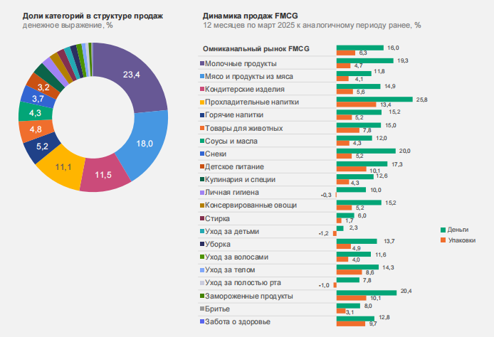 Доля СТМ занимает порядка 14% всех продаж. Наибольший вклад в их развитие среди продовольственных товаров вносят мясо, сыр, колбасные изделия, соки и молоко. Среди непродовольственных — туалетная бумага, подгузники, бумажные полотенца, влажные салфетки и персональные средства гигиены. При этом четверть представителей поколения Z (26%) заявили, что предпочтут частные марки брендированным товарам производителей.