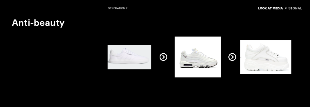 Отрицая классические каноны, поколение Z часто не довольствуется просто естественным и идет дальше — к нарочито уродливому. Примером может служить эволюция кроссовок: от классического ровного обтекаемого дизайна к уродливым футуристическим формам с массивной подошвой, которые стали безумно популярны в 2018 году. Старшее поколение не может понять, как можно носить «ретроджинсы с неудобной завышенной талией, неуклюжую обувь будто бы из ортопедического магазина, сочетание разномастных принтов и вещи словно с чужого плеча» (Gazeta.ru).