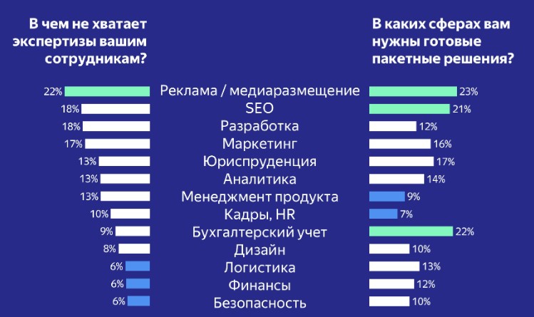 В числе важных проблем российские компании и предприниматели отметили недостаток внутренней экспертизы. Реклама и другое медиаразмещение — сфера, в которой острее всего бизнес испытывает трудности. 23% заинтересованы в готовых решениях для рекламного продвижения товаров и услуг. 31% представителей бизнеса заинтересованы в сервисах контекстной рекламы. Среди других пунктов были отмечены проблемы в SEO, разработке, маркетинге, юриспруденции и бухгалтерском учете.