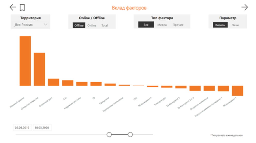 Все результаты моделирования доступны как на Россию, так и по отдельным регионам: как по онлайн, так и по офлайн магазину. В динамике, и в процентах за произвольный период по двум показателям: визиты и чеки.