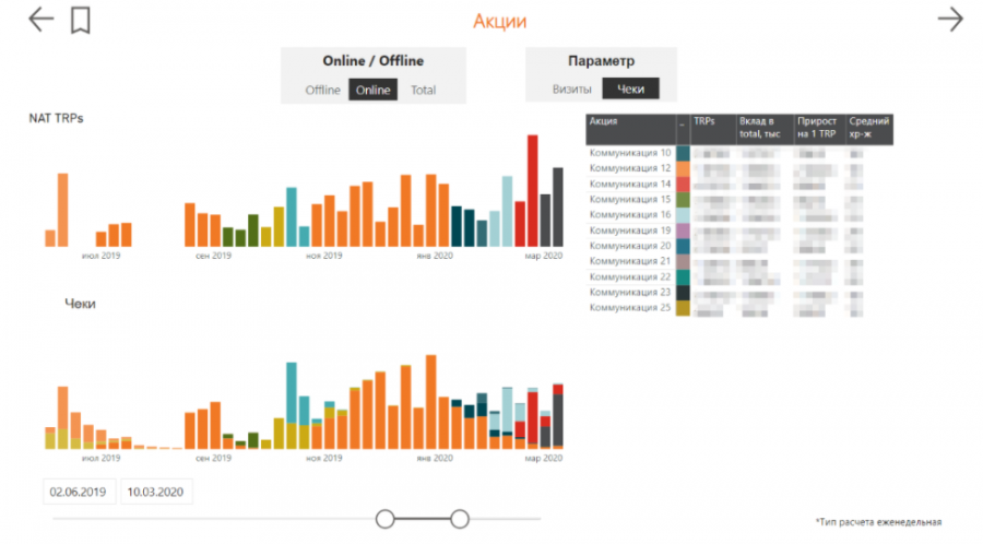 Ниже приведен пример модели Havas Media по регионам, результаты которой представлены в виде онлайн-дашборда. В основе проекта лежит две эконометрических модели, построенных на региональных данных по количеству чеков. Одна модель для офлайн каналов продаж, и вторая для онлайн.