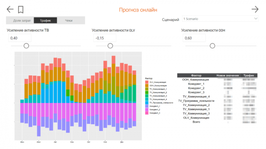 Мы создали не просто онлайн-дашборды, а инструмент прогнозирования и планирования на основе модели. Это потребовало интеграции скриптов на языке программирования R, которые и делают оценку прогноза «на лету». В примере ниже идёт сравнение сценариев по медиаактивности на будущее с точки зрения прироста трафика в магазинах.