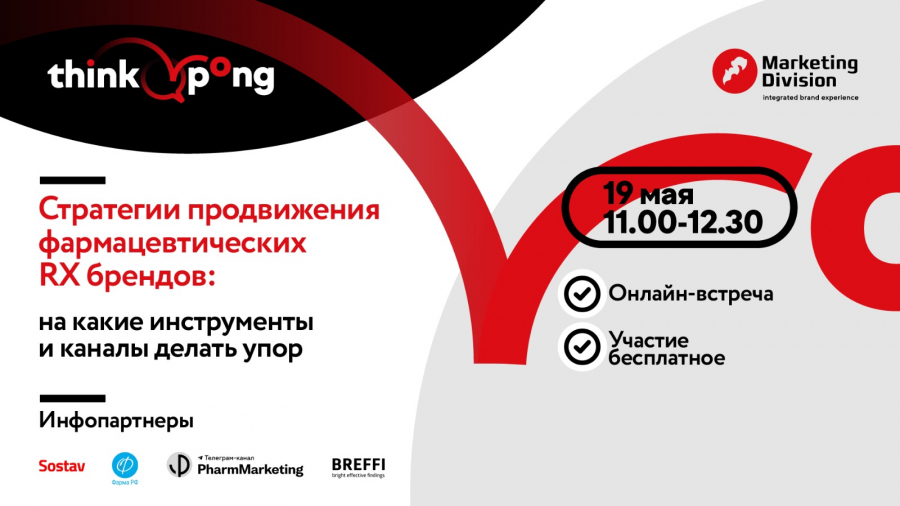 Онлайн-дискуссия Think Pong «Стратегии продвижения фармацевтических RX-брендов. На какие инструменты и каналы делать упор в 2022 году?» пройдет 19 мая в 11 утра по московскому времени. Доступ к событию будет бесплатным для всех зарегистрировавшихся участников. Об этом рассказали в коммуникационном агентстве