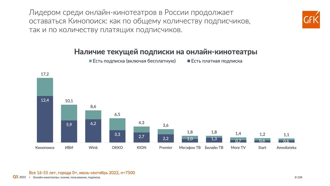 В третьем квартале 2022 года количество пользователей с подпиской на онлайн-кинотеатры выросло — в среднем подписка была оформлена у 44% горожан, платная — у 30%. Большинство пользователей — это жители Москвы и Санкт-Петербурга. Лидером среди онлайн-кинотеатров продолжает оставаться «Кинопоиск», число подписчиков которого выросло до 17,2%. Такие результаты получили исследователи компании GfK.