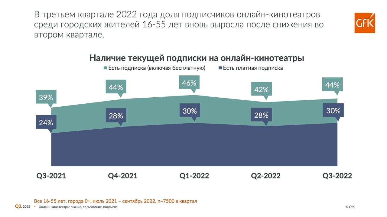 Во втором квартале 2022 года доля подписчиков онлайн-кинотеатров среди городских жителей 16−55 лет снизилась до 42%. Однако в третьем квартале показатели выросли: подписка оформлена у 44% горожан, что почти достигает показателей первого квартала — 46%. Число оформивших платную подписку тоже вернулось к показателям начала года — 30%, несмотря на уход Netflix и Megogo. Для сравнения, во втором квартале количество платящих упало до 28%.