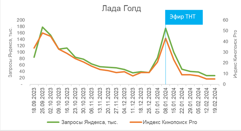 Также интересен пример с «Ладой голд» от «Иви», который был показан на телеканале ТНТ спустя четыре месяца после цифрового релиза. Поисковые запросы, инициированные эфирным промо сериала, показывали такой же рост интереса, как и при запуске сериала.