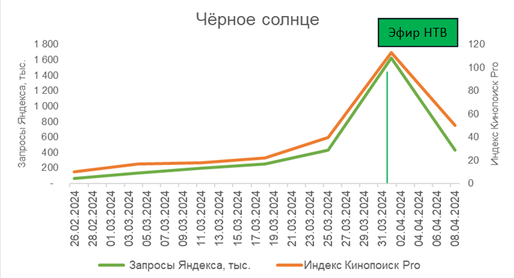 Даже самый популярный контент на стримингах имеет свойство «высматриваться», то есть естественный интерес к тайтлу со временем снижается без дополнительной маркетинговой поддержки. Показ фильма или сериала на ТВ традиционно поднимает новую волну внимания к контенту. По сути, анонсы сериала или сам телевизионный эфир становится дополнительным промо для контента стриминга. Например, поисковые запросы сериала «Чёрное солнце» от Kion кратно выросли на неделе, когда стартовал эфир на НТВ (цифровой релиз сериала — 1 марта 2024, эфир на НТВ — 1 апреля 2024). По сути, эфир сериала на телеканале сработал лучше маркетинговой кампании сервиса, и эта динамика отражена в росте интереса к сериалу в поисковых запросах.