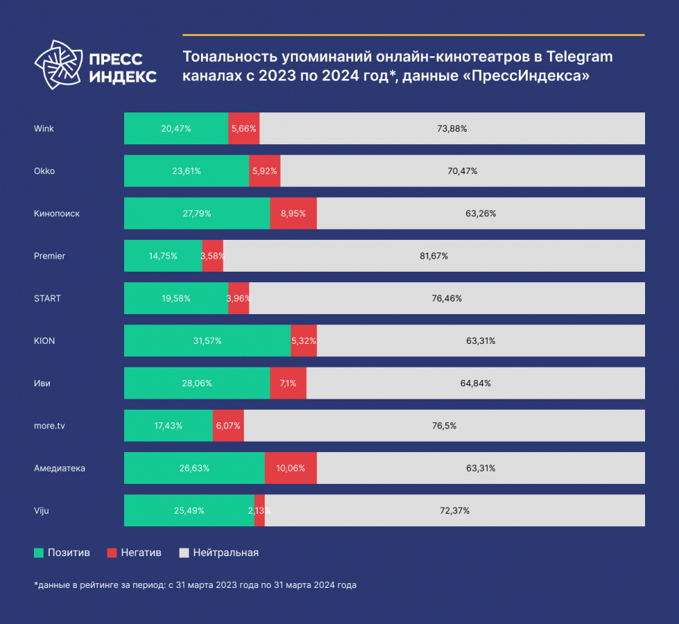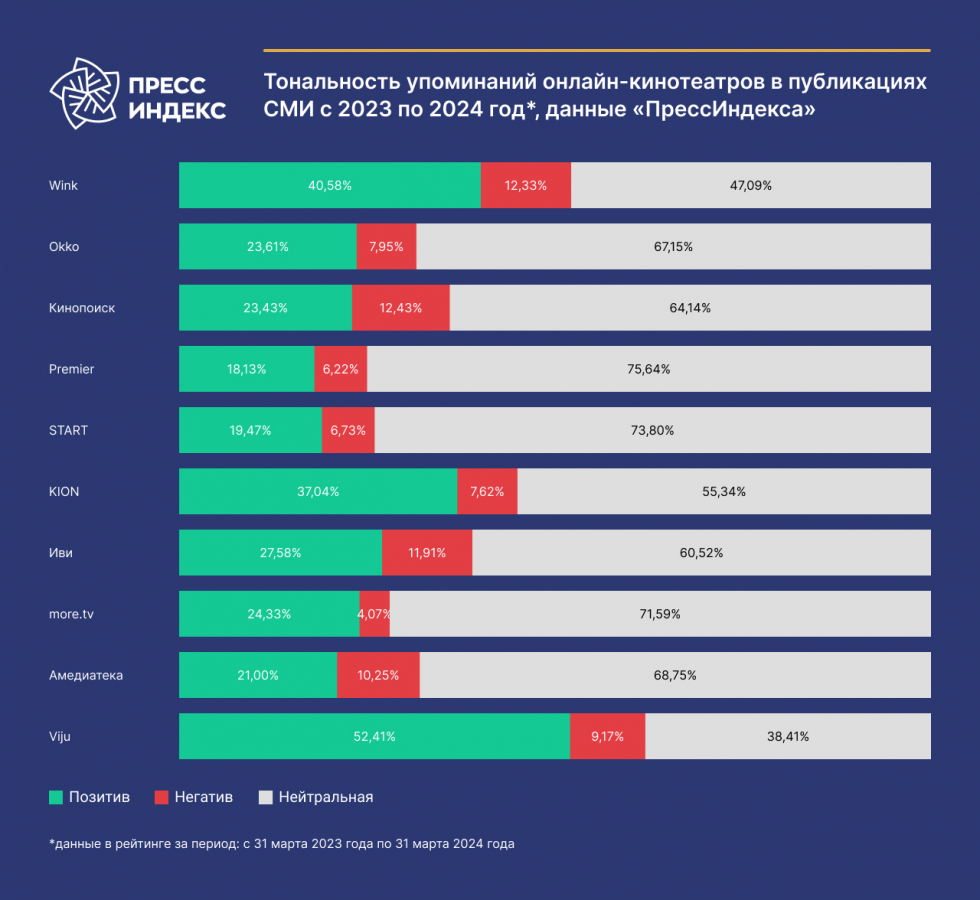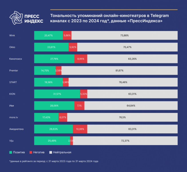 Больше всего положительных упоминаний в средствах массовой информации получили Viju, Wink и Kion. В топ-3 по негативным упоминаниям вошли «Кинопоиск HD», Wink и «Иви».