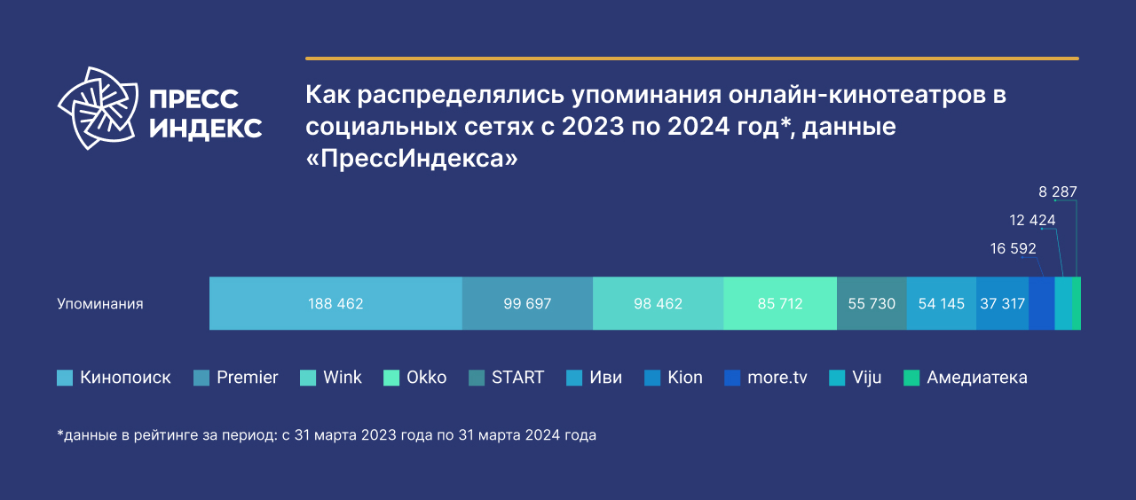 В соцсетях первое место по количеству упоминаний в постах занял «Кинопоиск HD» (более 188 тыс.), на второй строчке — Premier (99,6 тыс.), на третьей — Wink (98,4 тыс.).