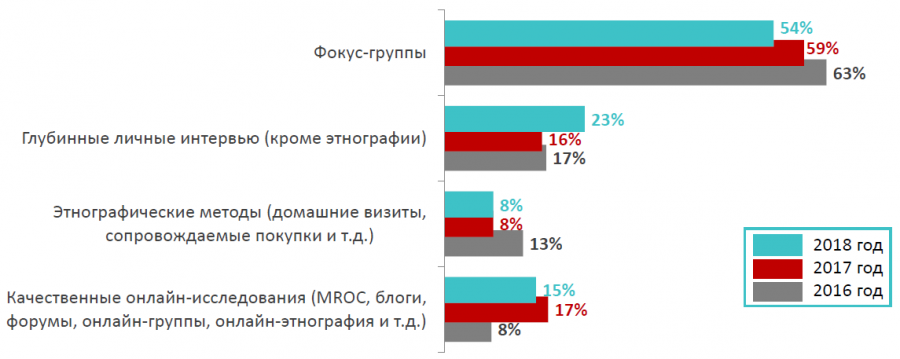 В области качественных исследований фокус-группы уверенно сохраняют лидерство, хотя их доля снизилась за последние два года на 9 пп., в то время, как доля «глубинников», наоборот, растет.