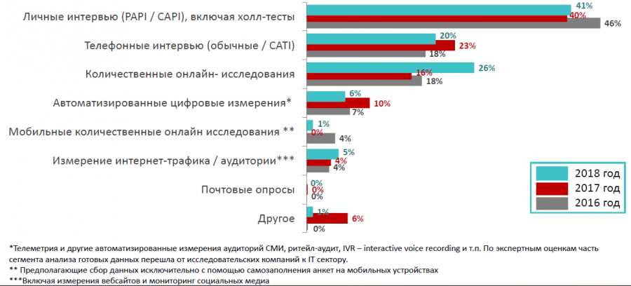 Внутри каждого из секторов — свои изменения. По мнению Александра Шашкина, гендиректора компании Online Market Intelligence (OMI) основным событием 2018 года в области количественных исследований увеличение доли онлайн-опросов, в результате которого, они заняли вторую позицию после личных интервью и впереди телефонных опросов (CATI).