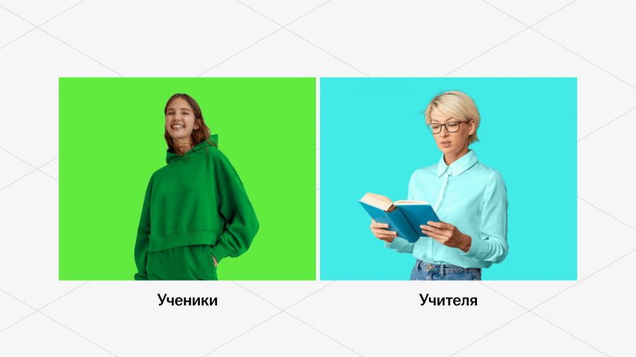 Ученики и преподаватели нанесены на «пространство успеха» в проекциях, которые соответствуют его сетке. Фоны меняются в зависимости от среды. Фотографии мы дополнили графическими объектами, перекликающимися со знаком и иллюстрациями школьных дисциплин.