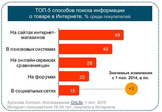 Меняются и подходы онлайн-покупателей к выбору товаров. Так, за год значимо выросла доля тех, кто выбирает товары, и покупает их онлайн. Наиболее предпочтительными источниками информации о товаре почти половина (49%) онлайн-шоперов назвала сайты онлайн-магазинов, еще 40% просто ищут информацию с помощью поисковых систем, 28% - предпочли сервисы сравнения цен. Значительно увеличилось число тех, кто использует для поиска информации о товаре социальные сети.