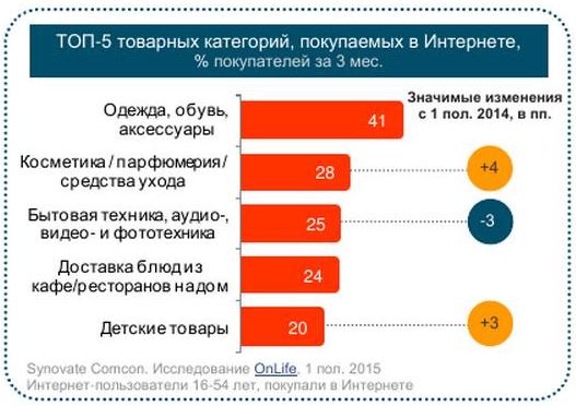 Примечательно, что среди активных интернет-пользователей доля совершавших покупки в Сети, несмотря на кризис, не изменилась и по-прежнему составляет 70%. Однако в первом полугодии 2015 года существенно изменился рейтинг популярных «сетевых» категорий товаров.