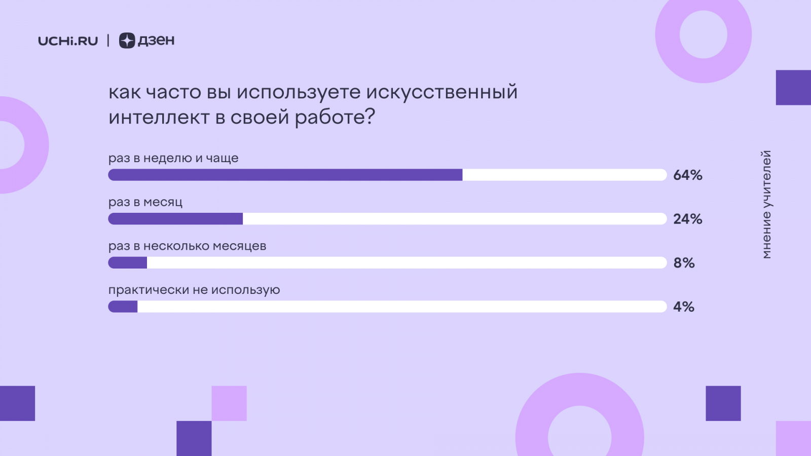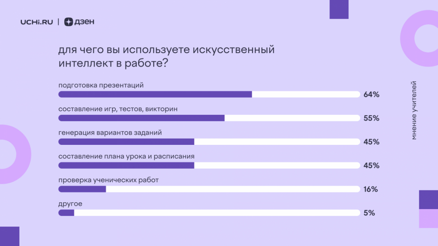 Больше половины учителей рассказали, что технологии помогают им в подготовке к урокам. 64% из них делают презентации с помощью искусственного интеллекта. Также педагоги применяют технологии для составления тестов и викторин (55%), генерации вариантов заданий (45%), создания плана уроков (45%) и проверки домашних заданий (16%).