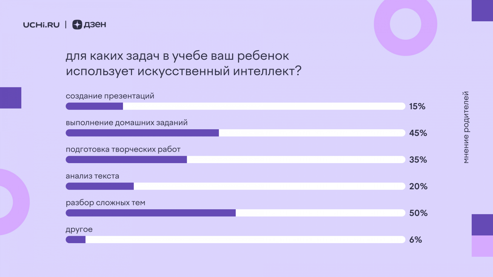Родители перечислили, для чего их дети применяют ИИ: разбор сложных тем, выполнение домашних заданий, подготовка творческих работ, анализ текстов и создание презентаций.