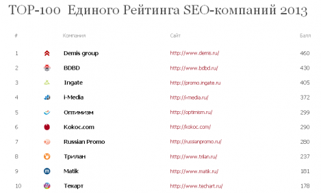 Четвертую строку сводного рейтинга занимает i-Media (в основном, благодаря двум первым местам в топах «TopSEOs» и «SeoNews: глазами клиента»). Замыкает пятерку лидеров одна из компаний «Element Group» - Optimism. И сама группа, и Optimism показывают высокие темпы роста на digital-рынке: так, в релизе, посвященном итогам 2012 года, представители компании подчеркнули, что на SEO-обслуживании в «Оптимизме» находится более 12 000 контрагентов.