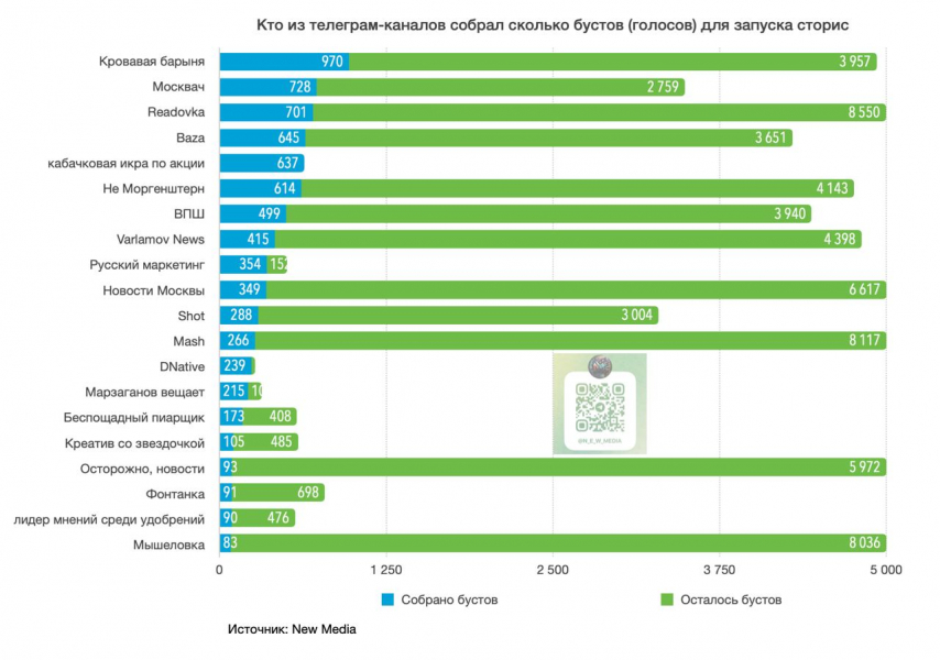 Telegram-канал Кровавая барыня занимает первое место по количеству собранных бустов для запуска сторис. На данный момент он собрал 970 голосов из 4927, подсчитал New Media. Второе место по собранным бустам занимают каналы Москвач и Readovka, у них по 728 и 701 голосу соответственно.