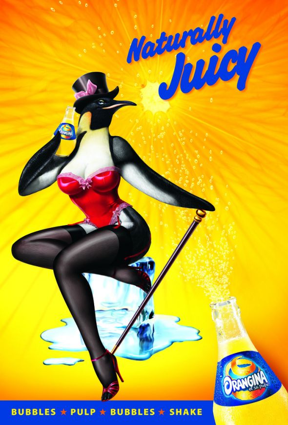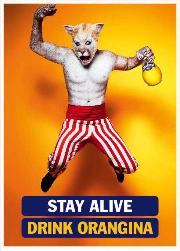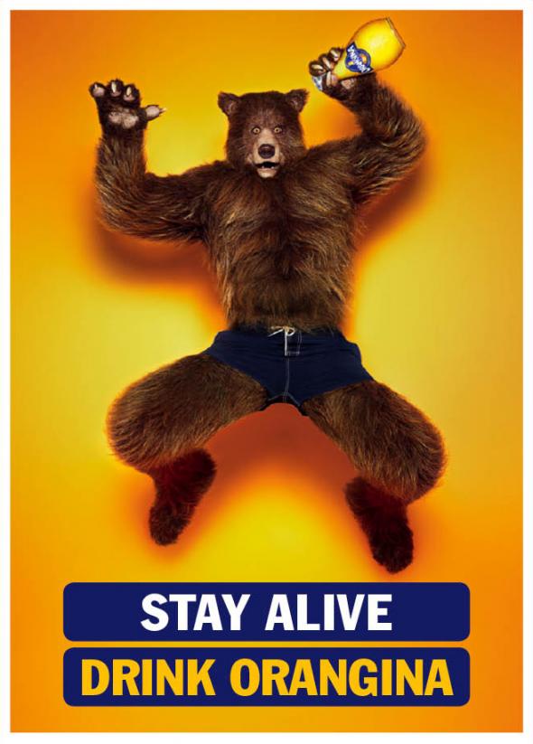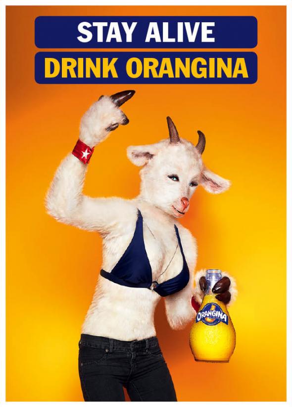 Кроме того, в рамках кампании вышли принты с изображением людей-животных на ярко-оранжевом фоне. Коза в купальнике, волк в полосатых бело-красных штанах и медведь в плавках призывают пить Orangina.