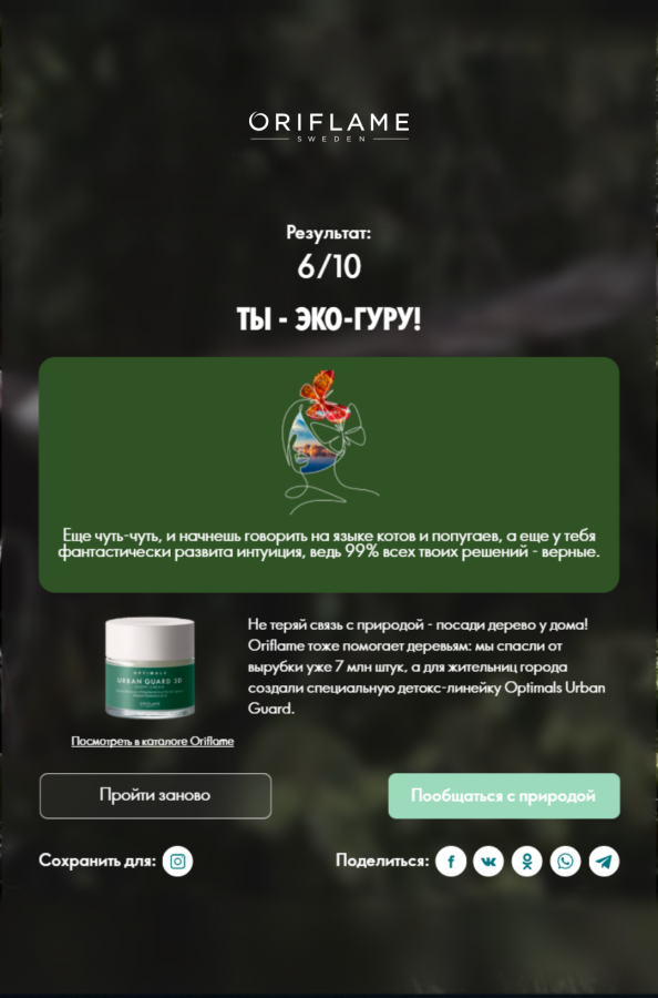 Бренд Oriflame в диджитал-кампании «Голос природы» поддержал устойчивое экологическое развитие (sustainability), которое направлено на укрепление способности окружающей среды выдерживать воздействие человека. Для этого был запущен онлайн-сервис, где можно найти советы по сохранению природы, услышать плеск волн и шелест трав, а также узнать о составе продукции Oriflame. Подробностями проекта с Sostav поделились в агентстве