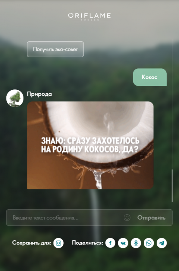 Командой был разработан сайт из двух разделов. Первый — «Видеочат-бот», в нем размещена информация о сохранении окружающей среды, а также 100 коротких видео с красивыми пейзажами, забавными животными, сведениями о полезных растениях с указанием, какие из них есть в составе косметики Oriflame.