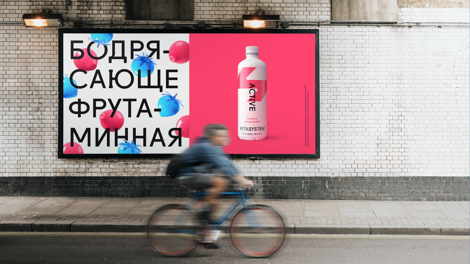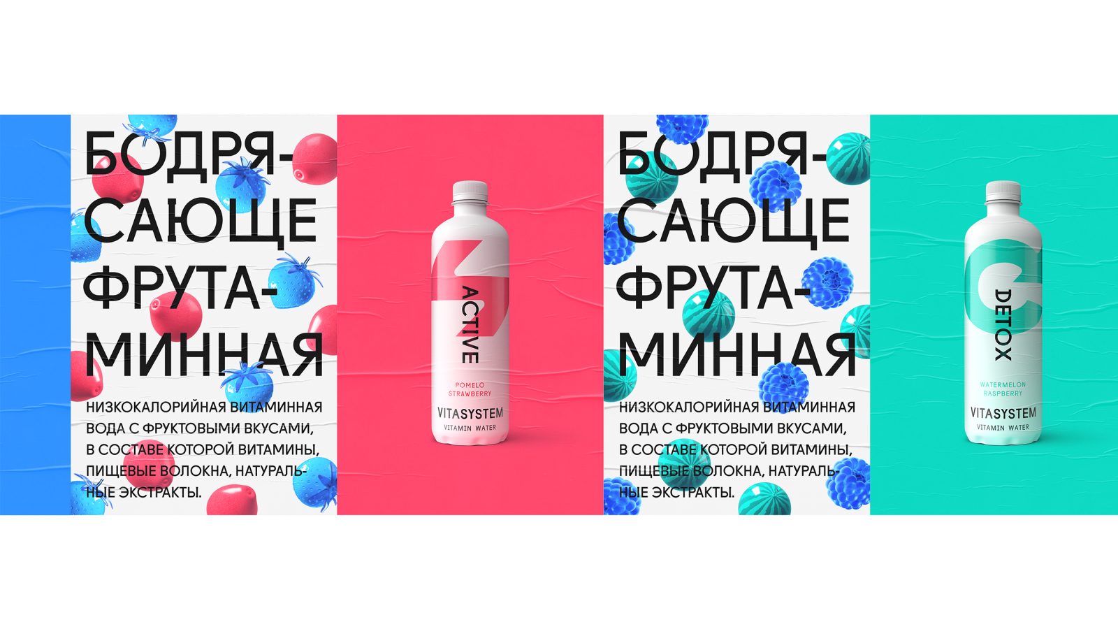 В поддержку минималистичного дизайна упаковки были разработаны яркие рекламные принты, главным героем которых стал вымышленный образ «Фрутамины» — микс фруктов и витаминов с глянцевой текстурой и инвертированными цветами.