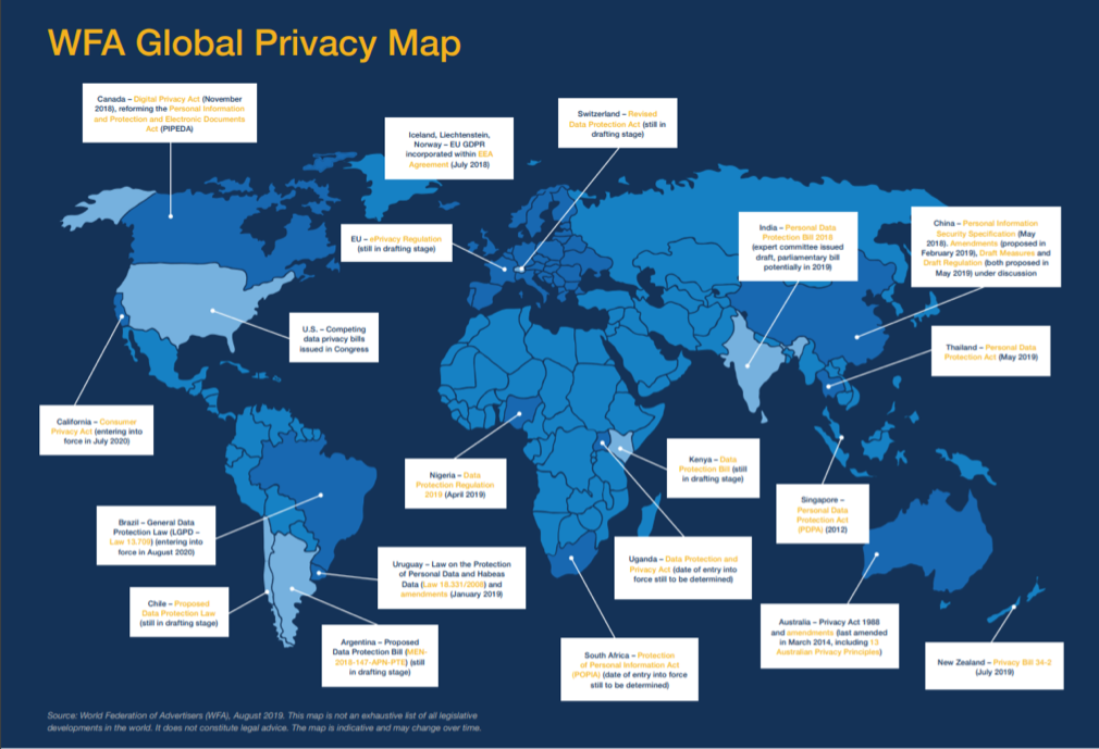 Мировая ассоциация рекламодателей (WFA) в августе 2019 обновила карту с обзором законов, принятых в сфере защиты данных и регулирования конфиденциальности на ключевых рынках.