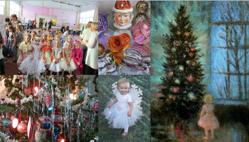Фотографии школьных праздников и старых ёлочных игрушек стали референсом для ролика про утренник. Костюм снежинки для девочки шился вручную — чтобы было похоже на то, что мамы мастерят сами.