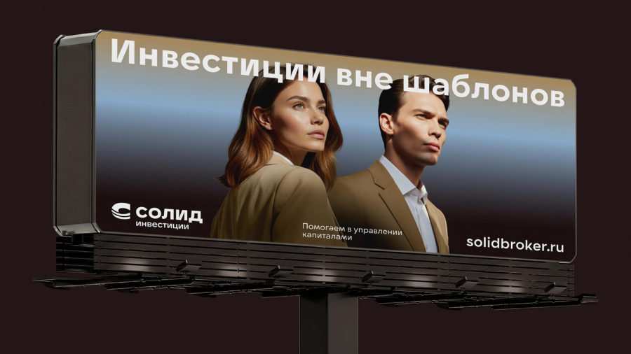 В итоге был выбран слоган «Вне шаблонов», потому что эта формулировка лучше резонирует с логикой фондового рынка и инвестиций. Кроме того, слоган органично работает в связке с названием: «Солид Инвестиции. Вне шаблонов». Фраза легко масштабируется в коммуникации и визуально поддерживает идею пересечения форм и выхода за рамки стандартных решений.