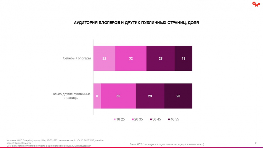Большинство респондентов имеет подписку на макроблоги, при этом среди молодой аудитории от 18 до 25 доля подписчиков на микроблогеров значительно выше.