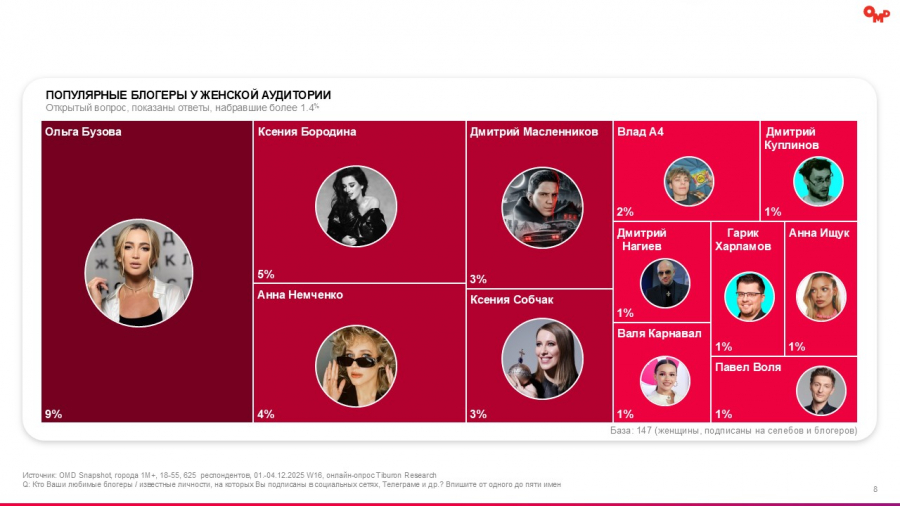 Женщины назвали топ-5 своих любимых блогеров: Ольга Бузова, Ксения Бородина, Анна Немченко, Дмитрий Маслеников и Ксения Собчак.