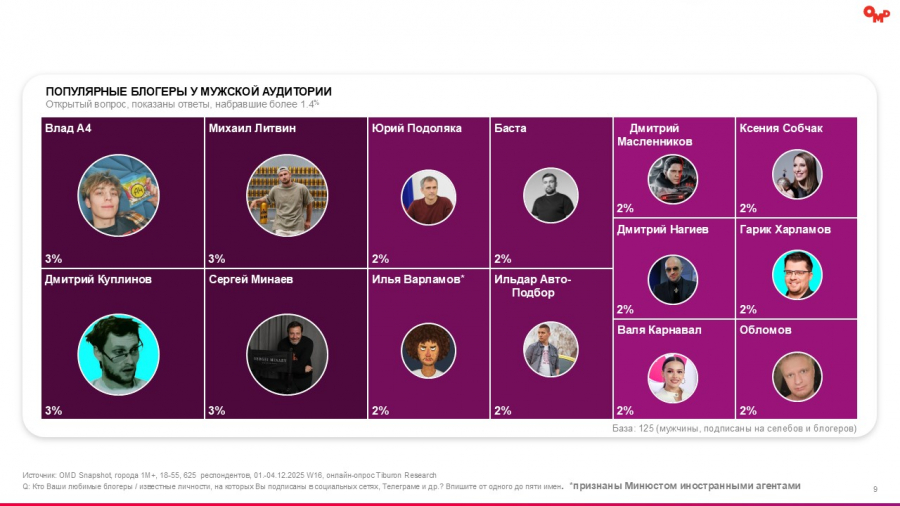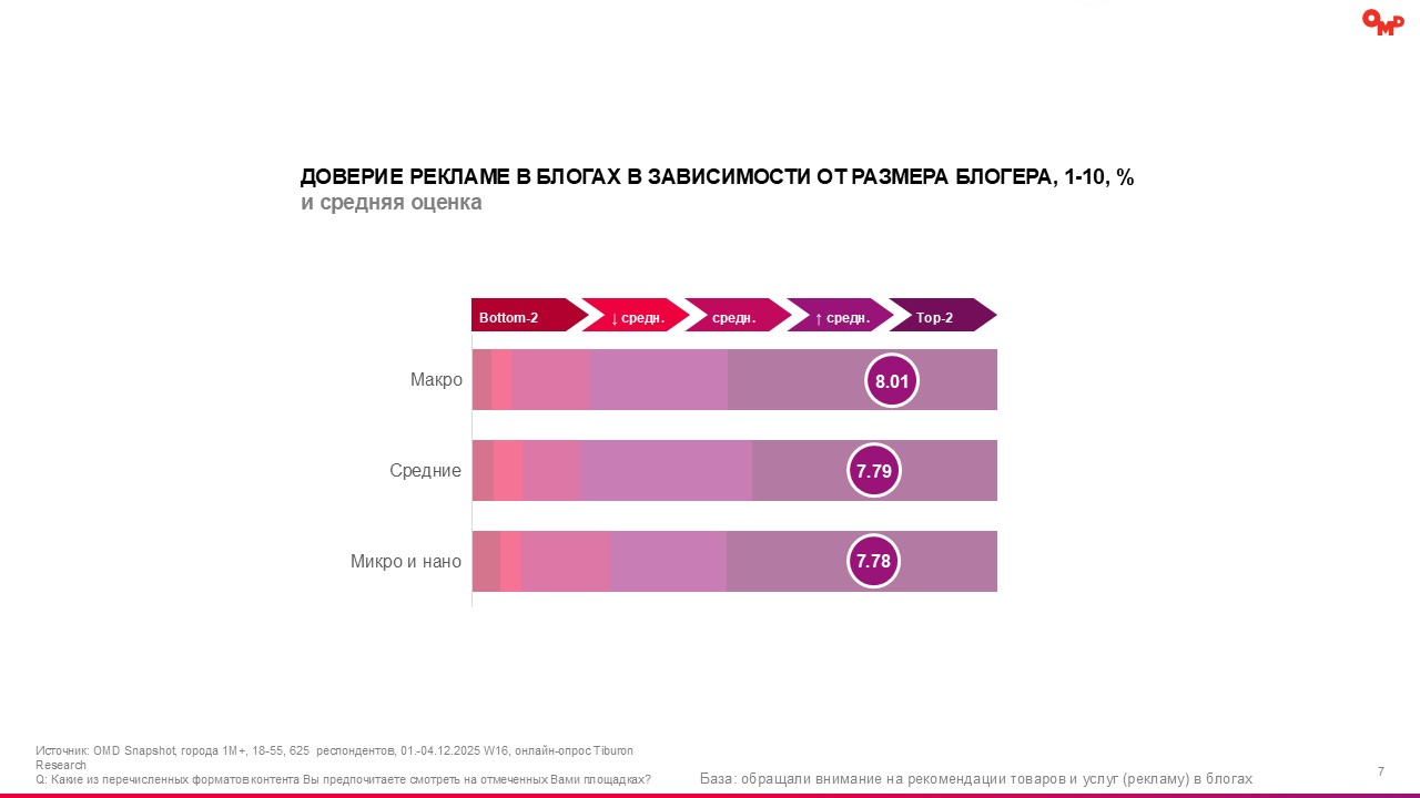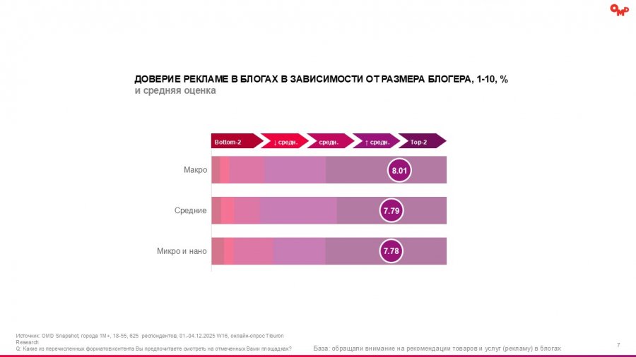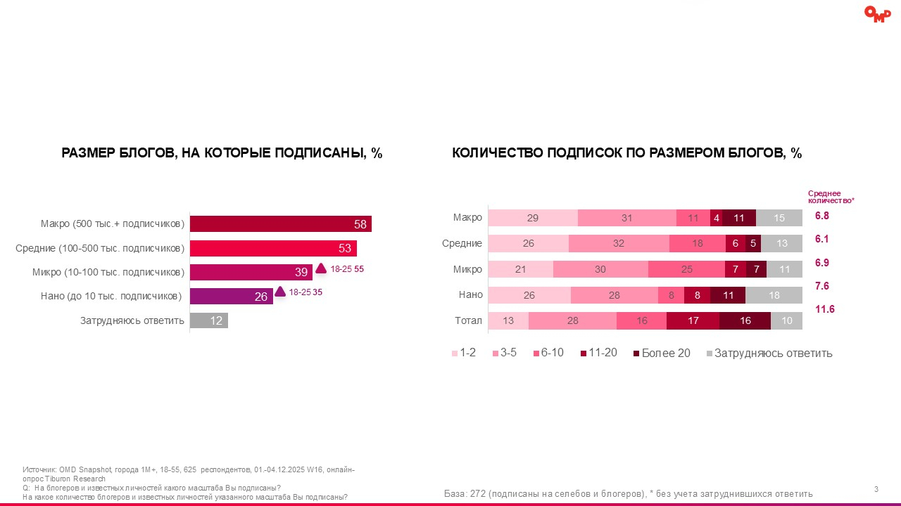 OMD OM Group совместно с Tiburon Research представило исследование влияния рекламных интеграций блогеров разных уровней известности на поведение покупателей. Эксперты рассказали Sostav, на кого подписаны большинство респондентов, влияет ли размер фан-базы блогера на доверие к нему и покупали ли опрошенные что-либо после рекомендации инфлюенсера.