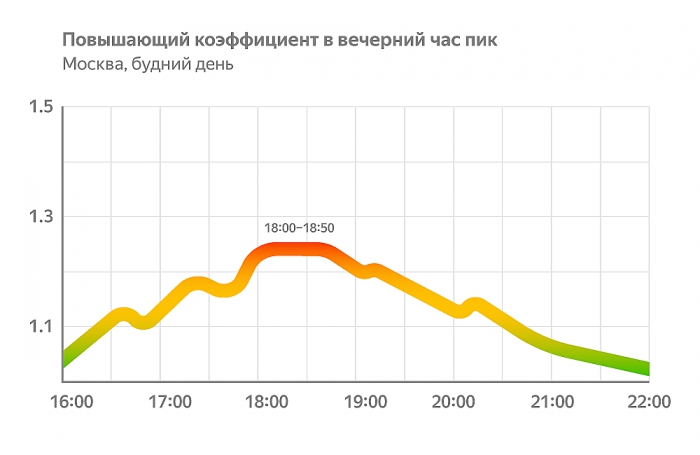 По данным компании, больше всего заказов в рабочие дни поступает с 08:30 до 08:45 и с 18:00 до 18:50. В эти часы наблюдается максимальное значение повышающего коэффициента. Поэтому тем, кто хочет с утра вовремя добраться на работу, а вечером быстро попасть домой, не переплачивая, специалисты заказывать такси за 15 минут до наступления пика или после него. Это позволит сэкономить на поездке 15–20 %.