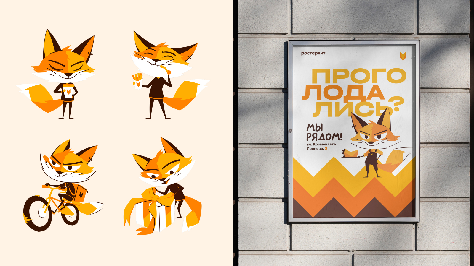 «Ростерхит» — изначально очень самобытный, крутой с точки зрения продукта, яркий по айдентике бренд. При этом его коммуникация была максимально скромной, продуктовой. Харизматичный маскот, для которого мы проработали не только эмоции и позы, но и бэкграунд, вербальная концепция с вызывающими аппетит лайнами, позиционирующий слоган и гибкий фирменный стиль раскрыли настоящий потенциал бренда и сформировали ту самую, крепкую эмоциональную связь с широкой аудиторией.