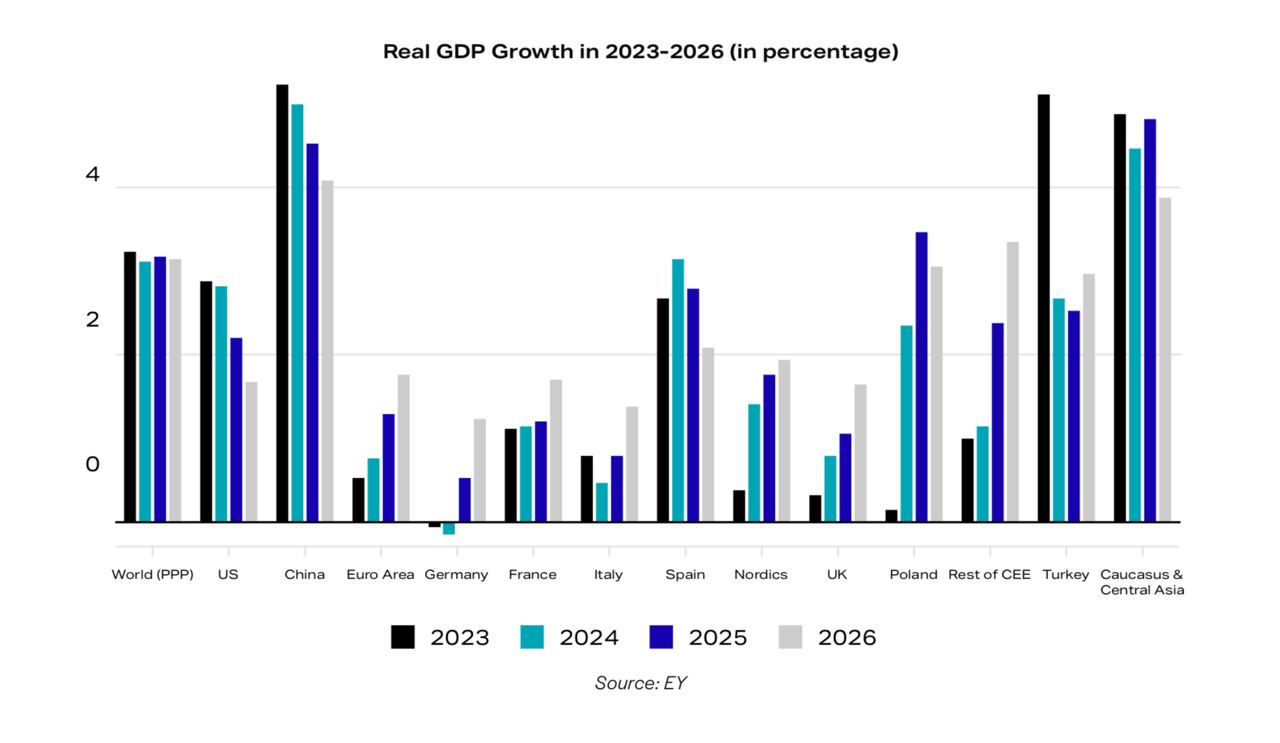 - Неравномерное восстановление. В Южной Европе (Испания, Греция) прогнозируется рост ВВП на 2−3,5%, тогда как Германия всего на 0,3% и Великобритания на 1%