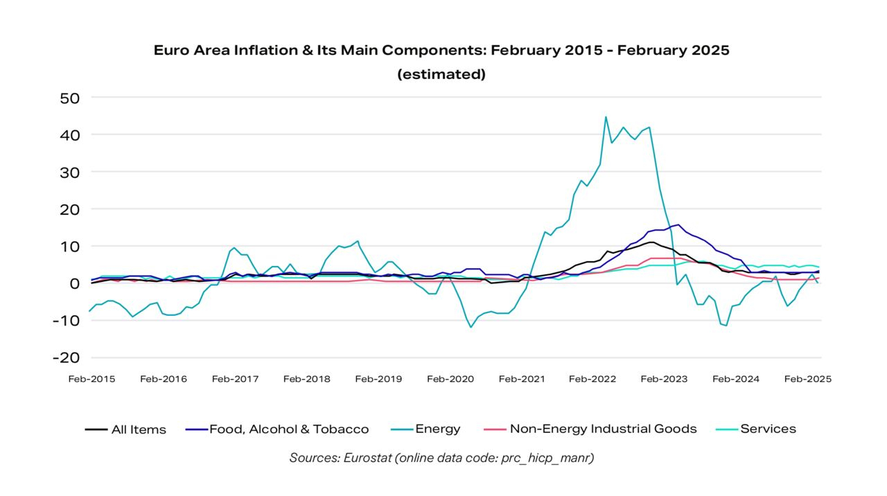- Инфляционный ущерб. По состоянию на первый квартал 2025 года инфляция в еврозоне составляет 2,2%, что превышает целевой показатель Европейского центрального банка в 2%. Хотя уровни инфляции на просторах крупнейших европейских экономик снизились с пиковых значений, они все еще остаются выше допандемийных уровней.