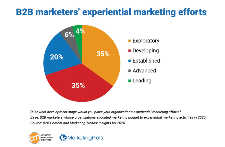 Более половины (52%) маркетологов B2B относят себя к категории лидеров, то есть их стратегия управления является устоявшейся (29%), передовой (17%) или лидирующей (6%). Остальные 48% все ещё находятся на стадии тестирования (26%) или разработки (22%).