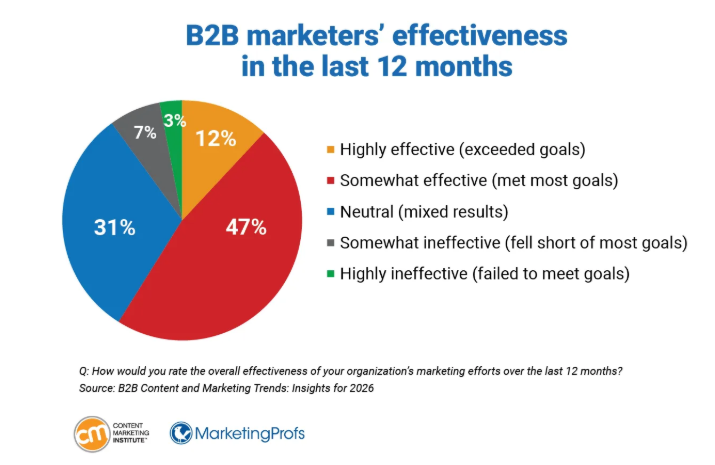 Более половины (59%) маркетологов считают, что их усилия как минимум достаточно эффективны. Однако почти половина из них не смогла дать точного ответа.