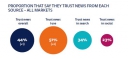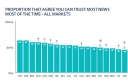 По данным Edelman Trust Barometer, снижается доверие ко многим институциям, в том числе к медиа. Уровень доверия к новостям «вообще» составляет 44%, к новостям в поиске — 34%, к новостям в соцсетях — 23%. Наибольшим доверием (51%) пользуются (вполне естественно) те медиа, которые потребитель читает чаще всего. Самый высокий уровень доверия к новостям отмечен в Финляндии и Португалии (62%), самый низкий — в Корее (25%).