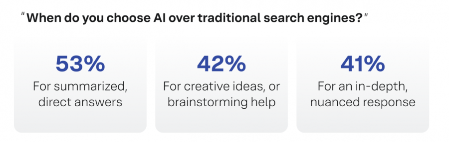 Искусственный интеллект больше не воспринимается как эксперимент — для многих он стал основным инструментом поиска информации, рекомендаций и ответов на вопросы. Согласно исследованию, 75% пользователей стали обращаться к ИИ чаще, чем год назад, а почти половина (43%) делает это ежедневно. 53% респондентов прибегают к ИИ для получения кратких и прямых ответов, 42% — для поиска креативных идей или брейнсторминга.