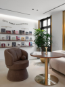 В зоне консультаций расположены мягкий диван для клиентов, кресло менеджера и стол для работы с фотографиями, что позволяет комфортно работать с выбранными снимками для будущего семейного архива. Молочный бархат диванов гармонично сочетается с кофейными креслами, визуально расширяя пространство.