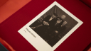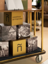 Бокс для выдачи готовых фотоальбомов оформлен в единой стилистике пространства и подчеркивает ключевые идеи проекта через визуальные коммуникации. Глубокий синий цвет создаёт атмосферу спокойствия и отсылает к прошлому. Деликатные надписи с тиснением и фольгированием, тактильные материалы делают процесс получения фотографий приятным и эстетически привлекательным.