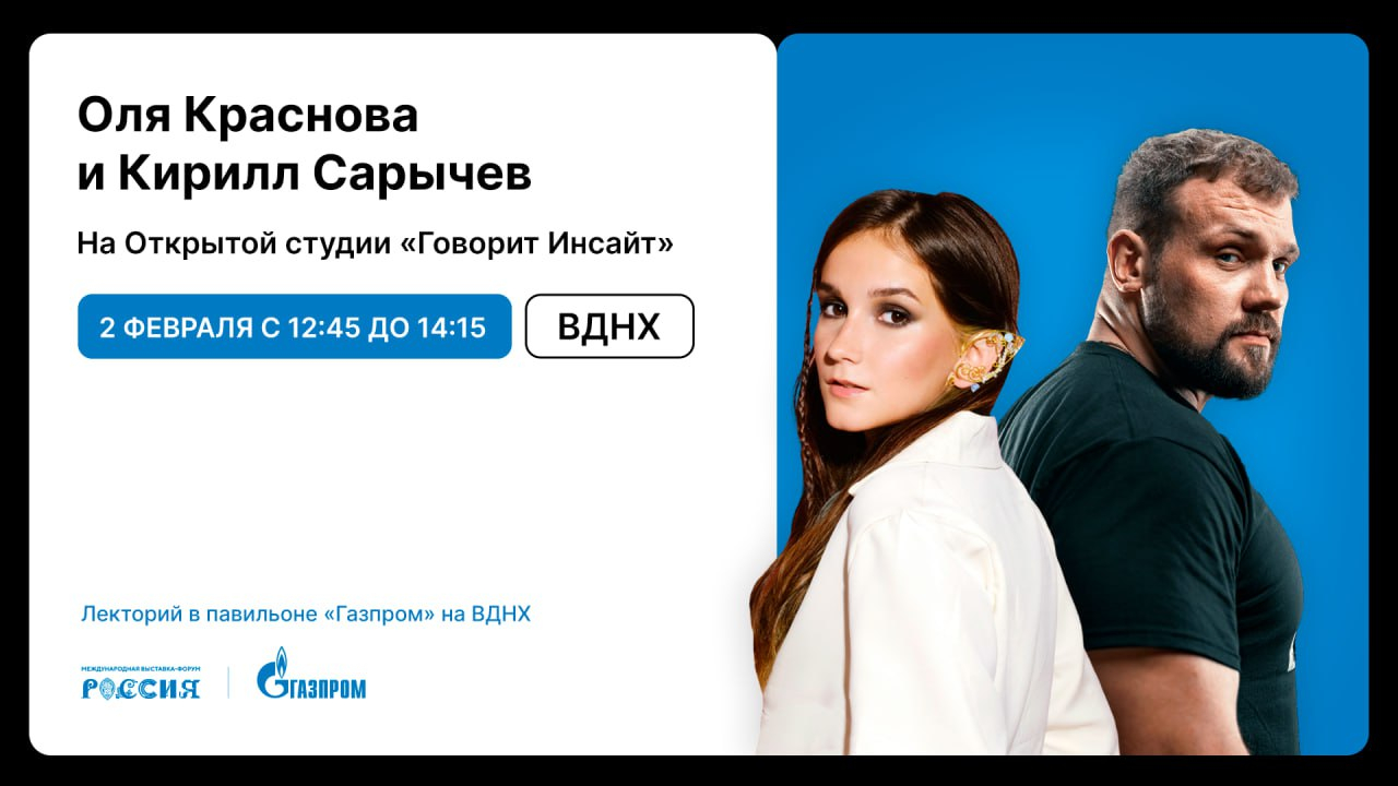 «Газпром-Медиа Холдинг» с ноября 2023 года, блогер Кирилл Сарычев и певица Оля Краснова станут участниками открытой студии «Говорит Инсайт» на ВДНХ. Они выступят в лектории павильона «Газпром» 2 февраля с 12:45 до 14:15 в рамках выставки-форума «Россия». Резиденты расскажут о своей истории успеха, поделятся опытом продвижения в социальных сетях и обсудят сферы музыки и спорта. Об этом Sostav рассказали представители центра.