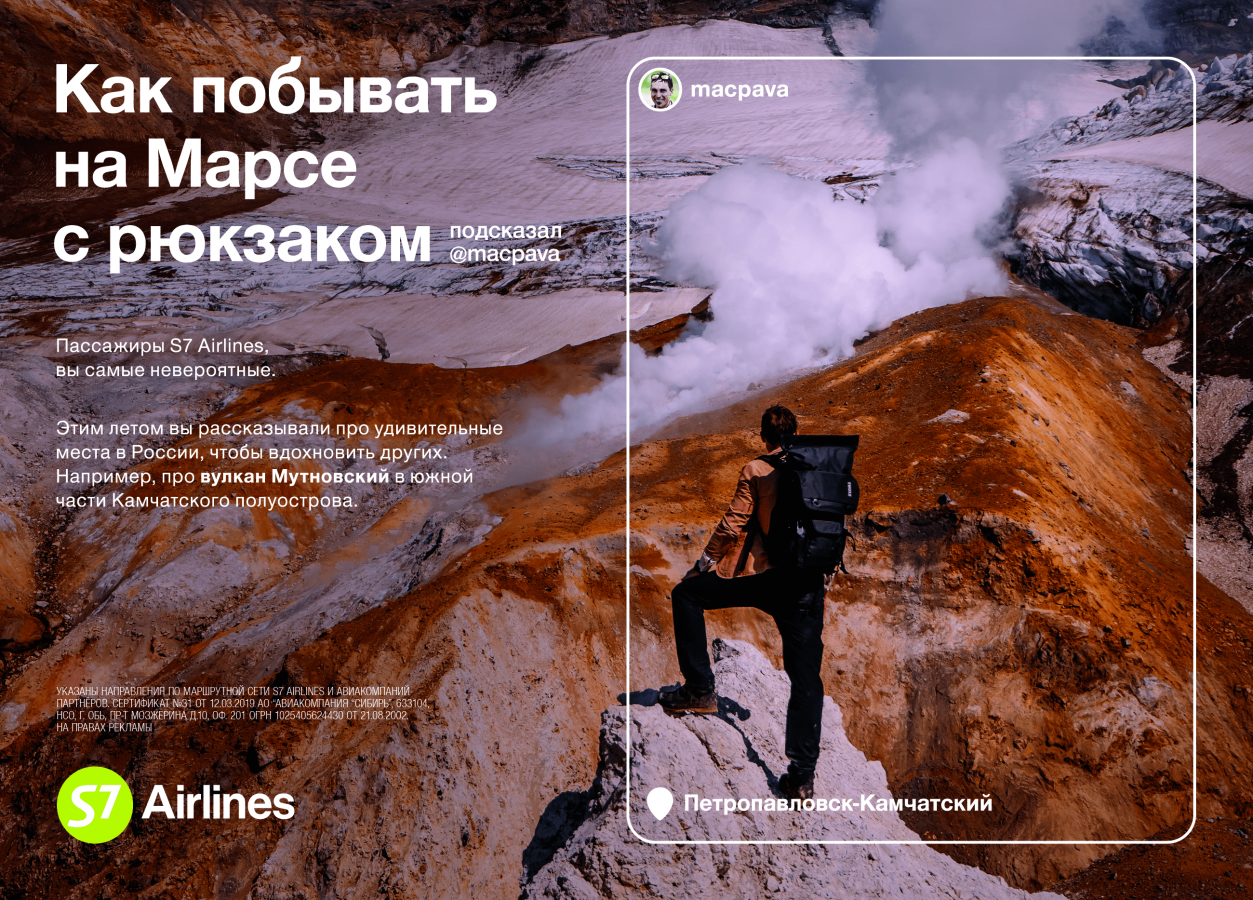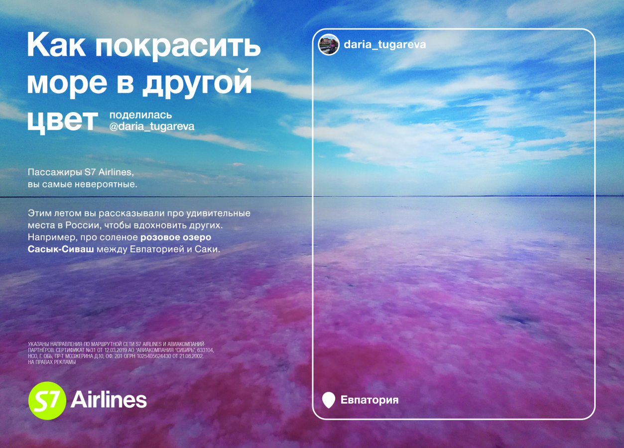 В рекламу вошли снимки покорения вулканов на Камчатке, наблюдения за звездами на Эльбрусе и прогулок по берегу розового озера в Крыму. S7 Airlines делает акцент на охватные digital-форматы: баннеры и посты в социальных сетях.